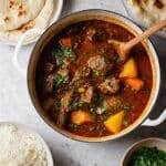 This curry freezes exceptionally well. Portion it out into freezer-safe containers and store for up to 3 months. When freezing, avoid adding garnish or fresh herbs which don’t freeze well; add those fresh when reheating.