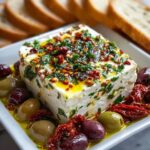 This Baked Feta with Olives & Sun-Dried Tomatoes recipe combines a block of creamy feta cheese baked to perfection with the bold flavors of Kalamata olives, sun-dried tomatoes, and fresh herbs. Drizzled with olive oil and seasoned with garlic and red pepper flakes, it creates a warm, melty, and flavorful dish perfect as a savory appetizer served with crusty bread for dipping.