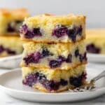 The image shows a close-up of several square pieces of golden brown cake with a soft and slightly crumbly texture. Each piece has a light top layer with a slightly cracked surface and visible dark purple spots of berries or fruit inside. One square piece is placed on top of the others, showing that the inside is moist and full of small dark purple fruit bits. The cake is arranged on a flat white marbled surface. photo taken with an iphone --ar 4:5 --v 7