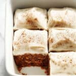 Spread the frosting evenly over the cooled carrot cake bars using an offset spatula or a butter knife. Slice into squares, serve, and dive into the perfect bite of moist, spiced carrot cake paired with tangy creaminess.