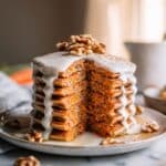 Tall stack of whole carrot pancakes on a large white plate, each pancake thick and fluffy with visible bits of grated carrot throughout, generously drizzled with creamy white icing glaze that cascades down the sides, topped with a small cluster of whole walnuts and a light sprinkle of cinnamon powder, surrounded by a few scattered walnuts on the plate, photographed from a 3/4 angle on a white marble countertop under natural lighting, professional food magazine hero shot photo taken with an iphone --ar 4:5 --v 7
