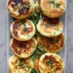 These Cheesy Potato Cakes are a crispy, golden treat packed with gooey melted cheese inside. Made from mashed gold potatoes mixed with potato starch, each disc is pan-fried to perfection in olive oil, delivering a deliciously creamy center and a crunchy exterior. Perfect as a snack, side dish, or appetizer, these cakes are simple to prepare and sure to please any crowd.