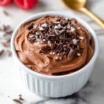 Single white ramekin filled with a rich and creamy chocolate mousse, topped with delicate chocolate shavings and a sprinkle of flaky sea salt, close-up angled shot emphasizing the smooth, airy texture and subtle peaks of the mousse, set on a white marble surface with natural lighting, styled as a ready-to-eat individual dessert portion, photo taken with an iphone --ar 4:5 --v 7