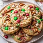 These Christmas Kitchen Sink Cookies are a festive and fun treat packed with a delightful mix of sweet and salty ingredients. Combining red and green M&M’s, white chocolate chips, pretzel pieces, potato chip pieces, and colorful sprinkles, these chewy, flavorful cookies are perfect for holiday celebrations and sure to please a crowd.