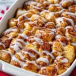 - For a crispier top, move some cinnamon roll pieces on top before baking to brown nicely.