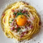 Classic Creamy Italian Spaghetti Carbonara is a rich and flavorful pasta dish made with crispy pancetta, creamy eggs, and sharp Pecorino Romano and Parmesan cheeses. This recipe combines simple ingredients to create an authentic Roman favorite, finished with a silky sauce made without cream, relying on the egg and cheese mixture for a luscious texture.