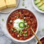 - Season and Serve: Taste the chili and adjust seasoning with more salt or cayenne pepper, if desired. Serve warm in bowls with your favorite chili toppings such as shredded cheese, sour cream, or chopped green onions.