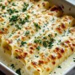 Keywords: Chicken Alfredo Lasagna Rolls, creamy lasagna, baked pasta rolls, Italian dinner, easy lasagna recipe, shredded chicken pasta, cheesy Alfredo lasagna