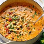 You can easily make a vegetarian Creamy Chicken Enchilada Soup Recipe by swapping chicken broth for vegetable broth and leaving out the chicken or replacing it with hearty beans or plant-based protein.