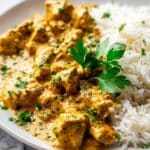 This Chicken Korma recipe offers a rich and creamy Indian-inspired curry made with tender boneless chicken thighs marinated in yogurt and spices, cooked with caramelized onions, cashews, and fragrant aromatic spices. The dish is finished with heavy cream for an indulgent texture and garnished with fresh cilantro, making it perfect served alongside steamed rice.