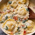 Cheese-filled ravioli, especially ricotta and Parmesan varieties, are perfect for this recipe because they melt beautifully into the creamy broth. You can use fresh or frozen ravioli depending on what you have on hand. Just adjust cooking times accordingly.
