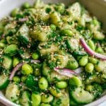 A refreshing and vibrant Cucumber Edamame Salad featuring crisp cucumbers, tender edamame, and a zesty dressing made from rice vinegar, tamari, and toasted sesame oil. This light and healthy salad is perfect as a side dish or a light meal, boasting fresh herbs and a touch of chili for a subtle kick.