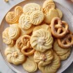 Classic Danish Butter Cookies that melt in your mouth, made with rich European salted butter, delicate vanilla, and a blend of all-purpose and cake flours. These cookies are piped into charming shapes, chilled to prevent spreading, and baked to a light golden perfection. Perfect for festive occasions or a delightful everyday treat.