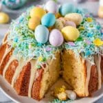 Keywords: Easter cake, bundt cake, mini egg cake, lemon icing, coconut cake, holiday dessert, festive cake, spring dessert, Cadbury mini eggs, colorful cake