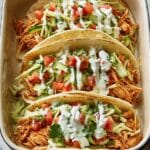 Large white rectangular baking dish filled with four fully assembled soft flour tortillas tacos, each packed generously with shredded seasoned chicken, topped with fresh julienned cucumber slices, chopped tomatoes, cilantro leaves, and drizzled with creamy white sauce, all arranged neatly side by side, photographed from a 3/4 angle with natural lighting on a white marble background, professional food magazine style hero shot photo taken with an iphone --ar 4:5 --v 7