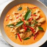 A flavorful and easy-to-make Thai Panang Chicken Curry featuring tender chicken simmered in a rich, creamy coconut and Panang curry paste sauce, garnished with kaffir lime leaves and fresh chili, served over fragrant jasmine rice. Ready in just 20 minutes, this dish combines authentic Thai flavors with simple cooking techniques for a delicious weeknight meal.