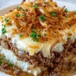A comforting French Onion Ground Beef and Rice Casserole combining savory caramelized onions, seasoned ground beef, tender rice, and melted Swiss cheese, topped with crispy fried onions for a deliciously crunchy finish. Perfectly baked to bring out rich flavors in an easy, hearty meal that serves six.