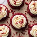 Keywords: red velvet cookies, cream cheese frosting, frosted cookies, dessert cookies, American cookies, soft cookies, chocolate cookies, holiday cookies, party treats