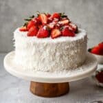 This moist and flavorful Gluten Free Coconut Cake is a perfect dessert for any occasion. Made with a blend of gluten free flour, shredded coconut, and creamy coconut milk, it is layered with a luscious coconut cream frosting and decorated with toasted shredded coconut and optional fresh strawberries. The cake bakes up tender and coconut-infused, making it an irresistible treat for coconut lovers and those with gluten sensitivities.