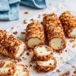 Working carefully, dip each frozen log into the warm caramel, ensuring it’s fully coated, then let any extra drip off. Immediately roll the caramel-coated log in the chopped pecans, pressing lightly to secure an even nutty crust. This part can be a bit tricky, but take your time—each log will look like a little golden treasure coated in crunchy pecan goodness. Place the finished logs on a parchment-lined sheet tray as you work your way through all eight.