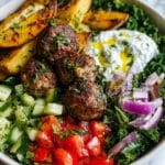 Keywords: Greek meatballs, tzatziki, Greek salad, roasted potatoes, Mediterranean bowl, healthy dinner, baked meatballs