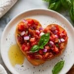 This heart-shaped bruschetta recipe features perfectly toasted French baguette slices topped with a flavorful mixture of cherry tomatoes, red onion, fresh basil, and crispy bacon. Finished with a drizzle of balsamic glaze, this appetizer is a charming and delicious crowd-pleaser that’s perfect for parties or a romantic snack.