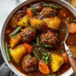 This hearty Meatball Stew is a comforting and flavorful dish featuring tender homemade beef meatballs simmered in a rich beef stock with fresh vegetables like potatoes, carrots, celery, green beans, and aromatic herbs. Perfect for a satisfying family meal, the stew is thickened to a luscious consistency and garnished with fresh parsley for a touch of brightness.