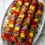 These Homemade Hawaiian Chicken Kabobs bring a perfect balance of sweet and savory flavors with tender marinated chicken breasts, colorful bell peppers, juicy pineapple chunks, and red onion, all grilled to perfection. The marinade combines a flavorful mix of ketchup, soy sauce, brown sugar, pineapple juice, sesame oil, ginger, garlic, and spices for a tropical-inspired feast ideal for summer cookouts or any casual meal.