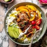 This Honey Lime Chili Chicken Bowl recipe features tender, oven-roasted chicken breasts or thighs seasoned with a flavorful blend of honey, lime, chili powder, and cumin. Accompanied by charred bell peppers and onions, served over fluffy cooked rice, and topped with fresh avocado, cherry tomatoes, yogurt, and a zesty salsa verde vinaigrette, this dish offers a perfect balance of sweet, tangy, and spicy flavors in a wholesome, easy-to-make meal.