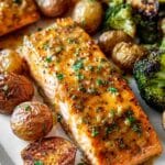 Keywords: Honey Mustard Salmon, Baked Salmon, Easy Salmon Recipe, Healthy Salmon Dinner, One Pan Meal, Roasted Potatoes and Broccoli, Honey Mustard Marinade