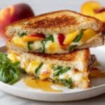 This Honey Peach & White Cheddar Grilled Cheese is a delightful twist on the classic grilled cheese sandwich, combining sweet, juicy peach slices with sharp white cheddar, fresh basil, and a drizzle of honey. Buttered sourdough bread is grilled to golden perfection, creating a gooey, savory-sweet sandwich perfect for a quick lunch or comforting snack.