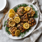 Juicy and flavorful grilled chicken thighs marinated in lemon juice, garlic, olive oil, and herbs. Slightly charred and caramelized, these chicken thighs are perfect for summer cookouts or a weeknight protein boost. Served with lemon wedges and fresh dill for brightness.