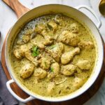 Large white saucepan filled with creamy, rich chicken curry featuring whole tender chicken pieces simmered in a thick, herb-speckled green sauce with visible swirls of olive oil on the surface, presented on a wooden board atop a white marble countertop, natural lighting accentuating the texture and warmth of the dish, professional 3/4 angle food magazine style photo taken with an iphone --ar 4:5 --v 7