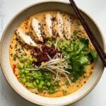 When noodles are perfectly tender, ladle the broth and noodles into two bowls. Thinly slice the cooked chicken and arrange on top. Garnish generously with fresh coriander, crunchy beansprouts, bright edamame beans, sliced spring onion, and a drizzle of spicy chilli oil for that final pop of color and heat. This is it — your homemade Marry Me Chicken Ramen Recipe is ready to dazzle.