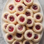 Large white serving platter filled with an array of delicate thumbprint cookies, each topped with a glossy red jam center and generously dusted with powdered sugar, arranged neatly to showcase their uniform round shape and soft texture, photographed from a professional overhead angle on a white marble countertop with natural lighting, capturing a full view of the entire batch as a hero shot from a food magazine, photo taken with an iphone --ar 4:5 --v 7
