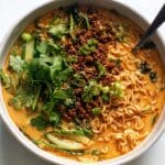 Miso Peanut Ramen Bowls combine crispy tofu, a rich and creamy miso-peanut broth, and tender ramen noodles for a satisfying and flavorful meal. This recipe features a savory blend of Japanese-inspired ingredients with a hint of red curry spice, finished with fresh cucumber, cilantro, and chili crisp for a perfect balance of textures and flavors.