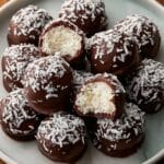 Keywords: No bake dessert, coconut cream balls, chocolate coated coconut balls, easy coconut treats, holiday desserts, party snacks