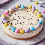 - Impressive presentation: Colorful Cadbury Mini Eggs, Easter M&M’s, and sprinkles make this cheesecake a stunning centerpiece.
