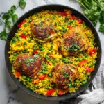 A comforting one-pot meal of juicy spiced chicken thighs nestled in fragrant yellow rice with green peas and bell peppers. Bold flavors meet simple preparation in this colorful and satisfying weeknight dinner. With its warm spices and vibrant vegetables, this dish brings both nourishment and convenience to the table.