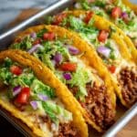 These Oven-Baked Cheesy Tacos are a delicious, crispy, and loaded meal perfect for a quick weeknight dinner. Ground beef is seasoned and cooked with onions and garlic, then combined with tomato sauce before being spooned into hard taco shells. Topped generously with melted cheese and fresh, vibrant toppings like lettuce, tomatoes, and cilantro, these tacos offer a perfect balance of savory, tangy, and fresh flavors all baked to perfection for a crispy finish.