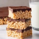 Deliciously gooey Peanut Butter Rice Krispie Treats topped with a smooth layer of chocolate. These no-bake bars combine the classic crispy cereal treat with creamy peanut butter and a decadent chocolate finish, perfect for parties, snacks, or anytime sweet craving.