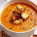 This Perfect Roasted Tomato Basil Soup is a rich, creamy, and flavorful soup made by roasting roma tomatoes to unlock deep caramelized flavors, then simmering with fresh herbs, onions, and crushed San Marzano tomatoes. Finished with a splash of heavy cream for silkiness and topped with homemade garlic basil croutons, this comforting soup is ideal for cozy meals year-round.