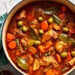 Large white enameled cast iron Dutch oven filled with rich, hearty chicken stew featuring tender chunks of chicken, vibrant slices of carrot, plump green olives, and whole bay leaves simmering in a deeply seasoned tomato-based broth, the glossy surface of the stew shimmering under natural light, photographed from a 3/4 angle on a white marble countertop with a clean, professional food styling, whole dish fully visible in frame, photo taken with an iphone --ar 4:5 --v 7