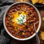 - Adjust Seasoning and Serve: Taste the chili and adjust salt and pepper as needed. Serve hot, topped with your choice of garnishes such as roasted pumpkin seeds, sour cream, shredded sharp cheddar cheese, and sliced avocado for added richness and texture.