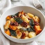 This Pumpkin Gnocchi Bake is a creamy, cheesy, and nutty comfort dish perfect for a chilly autumn dinner. Combining crisp and soft textures, it features tender pumpkin cubes, pillowy gnocchi, and a deliciously bubbling cheese topping with crunchy pecans and crisp sage leaves. Quick, easy, and satisfying, it’s an ideal family meal that can be made using either an air fryer or oven.