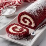 When ready to serve, unwrap the chilled cake, optionally dust the top with powdered sugar for an elegant touch, and slice into 12 even pieces using a serrated knife. For clean cuts, rinse and dry your knife between slices. There you have it—the perfect Red Velvet Cake Roll!