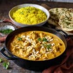 Fluffy basmati rice, warm naan, and a fresh cucumber raita make perfect accompaniments.