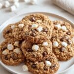White round plate filled with a full batch of freshly baked oatmeal cookies generously studded with melted chocolate chips and toasted mini marshmallows, arranged in an inviting stack that showcases their golden-brown, textured surface, photographed from a 3/4 angle on a pristine white marble countertop with natural lighting for a professional food magazine hero shot, photo taken with an iphone --ar 4:5 --v 7
