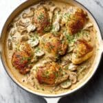Large white enameled cast iron skillet filled with whole golden-browned chicken pieces simmering in a rich, creamy mushroom and onion sauce, garnished with freshly chopped parsley, presented on a white marble countertop, captured in natural lighting from a 3/4 angle, professional food magazine hero shot photo taken with an iphone --ar 4:5 --v 7