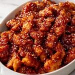 Sprinkle toasted sesame seeds and sliced green onions over the chicken just before serving. These final touches add subtle crunch and a fresh, vibrant contrast to the sticky, sweet sauce.